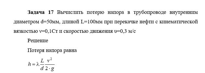 Задача 17 Вычислить потерю напора в трубопроводе внутренним диаметром d=50мм, длиной L=100мм при перекачке нефти с кинематической вязкостью ν=0,1Ст и скоростью движения υ=0,3 м/с