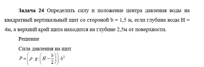 Задача 24 Определить силу и положение центра давления воды на квадратный вертикальный щит со стороной b = 1,5 м, если глубина воды Н = 4м, а верхний край щита находится на глубине 2,5м от поверхности.