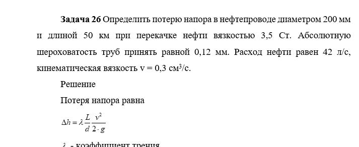 Задача 26 Определить потерю напора в нефтепроводе диаметром 200 мм и длиной 50 км при перекачке нефти вязкостью 3,5 Ст. Абсолютную шероховатость труб принять равной 0,12 мм. Расход нефти равен 42 л/с, кинематическая вязкость v = 0,3 см3/с.