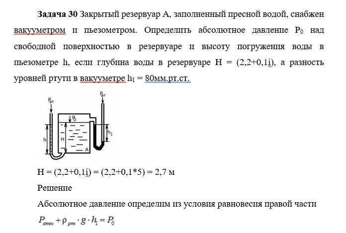 Задача 30 Закрытый резервуар А, заполненный пресной водой, снабжен вакууметром и пьезометром. Определить абсолютное давление Р0 над свободной поверхностью в резервуаре и высоту погружения воды в пьезометре h, если глубина воды в резервуаре Н = (2,2+0,1i), а разность уровней ртути в вакууметре h1 = 80мм.рт.ст.