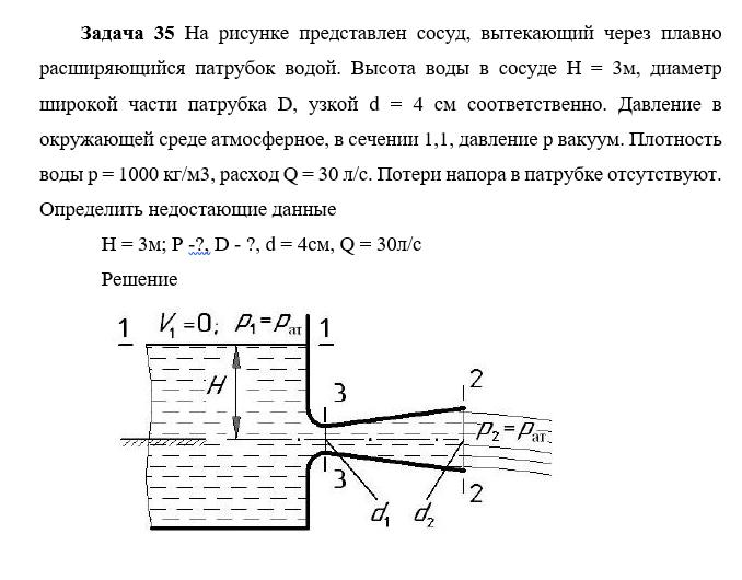 Задача 35 На рисунке представлен сосуд, вытекающий через плавно расширяющийся патрубок водой. Высота воды в сосуде Н = 3м, диаметр широкой части патрубка D, узкой d = 4 см соответственно. Давление в окружающей среде атмосферное, в сечении 1,1, давление р вакуум. Плотность воды р = 1000 кг/м3, расход Q = 30 л/с. Потери напора в патрубке отсутствуют. Определить недостающие данные