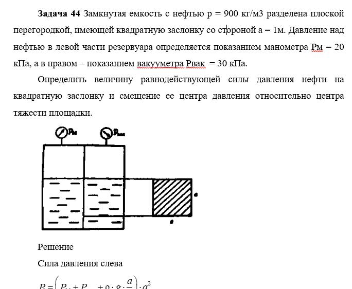 Задача 44 Замкнутая емкость с нефтью р = 900 кг/м3 разделена плоской перегородкой, имеющей квадратную заслонку со стороной а = 1м. Давление над нефтью в левой части резервуара определяется показанием манометра Рм = 20 кПа, а в правом – показанием вакууметра Рвак = 30 кПа.