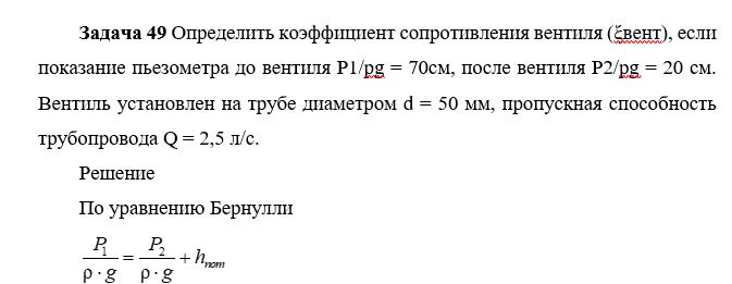 Задача 49 Определить коэффициент сопротивления вентиля (ξвент), если показание пьезометра до вентиля P1/pg = 70см, после вентиля P2/pg = 20 см. Вентиль установлен на трубе диаметром d = 50 мм, пропускная способность трубопровода Q = 2,5 л/с.