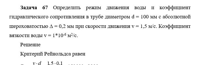 Задача 66 Определить режим движения воды и коэффициент гидравлического сопротивления в трубе диаметром d = 100 мм с абсолютной шероховатостью Δ = 0,2 мм при скорости движения v = 1,5 м/с. Коэффициент вязкости воды v = 1*10-6 м2/с.