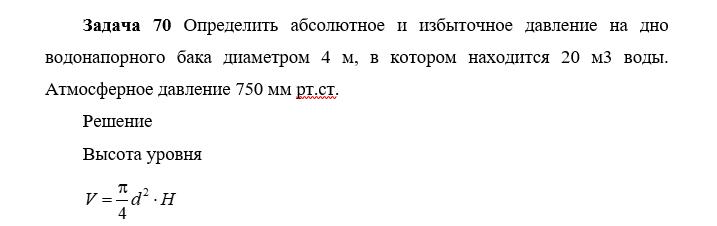 Задача 70 Определить абсолютное и избыточное давление на дно водонапорного бака диаметром 4 м, в котором находится 20 м3 воды. Атмосферное давление 750 мм рт.ст.