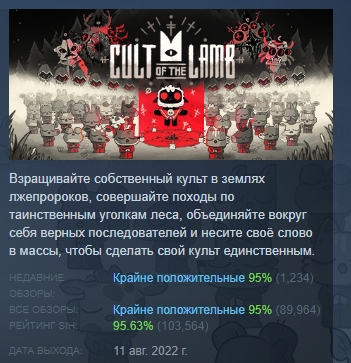 В Cult of the Lamb вы окажетесь в роли одержимого ягнёнка, спасённого от гибели жутким незнакомцем. Чтобы вернуть долг своему спасителю, вам придётся найти ему верных последователей. Взращивайте собственный культ в землях лжепророков, совершайте походы по таинственным уголкам леса, объединяйте вокруг себя верных последователей и несите своё слово в массы, чтобы сделать свой культ единственным.