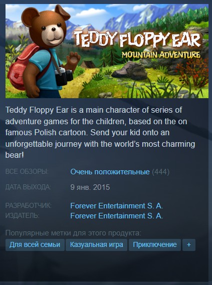 🎨Игрушка «Teddy Floppy Ear», основанная на известном польском мультфильме, станет отличным развлечением для детей в возрасте 3-8 лет. Подготовленная опытной командой, «Teddy Floppy Ear – Mountain Adventure» сочетает в себе увлекательную приключенческую игру со здоровой дозой обучения. В этом эпизоде наш главный герой отправляется в продолжительный визит к своему дяде, художнику, который живет глубоко в горах. Там он отправляется на экскурсию, во время которой изучает основы искусства, смешивание цветов, распознавание форм и многое другое. Во время этих путешествий он решает многочисленные мини-игры, чтобы развлечь себя. Красивая графика с ручной росписью, успокаивающая музыка, занимательная и свободная от насилия история займут вашего ребенка на несколько часов.