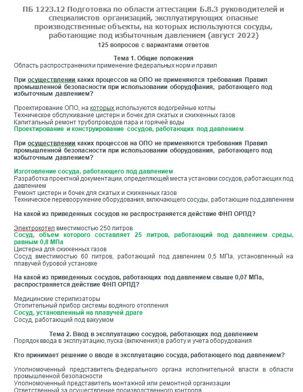 Вопросы с ответами к курсам ОКС-Олимп Б.8.3 ПБ 1223.12 (август 2022) Подготовка и аттестация руководителей и специалистов организаций, эксплуатирующих сосуды, работающих под избыточным давлением, на опасных производственных объектах