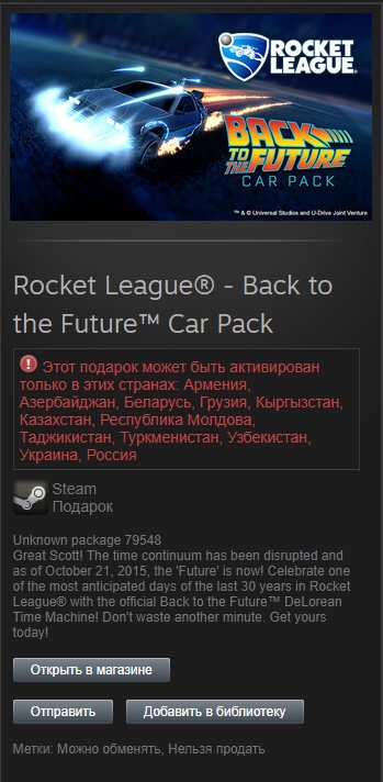 Rocket League Back to the Future Gift (DLS) RU/CIS в STEAM