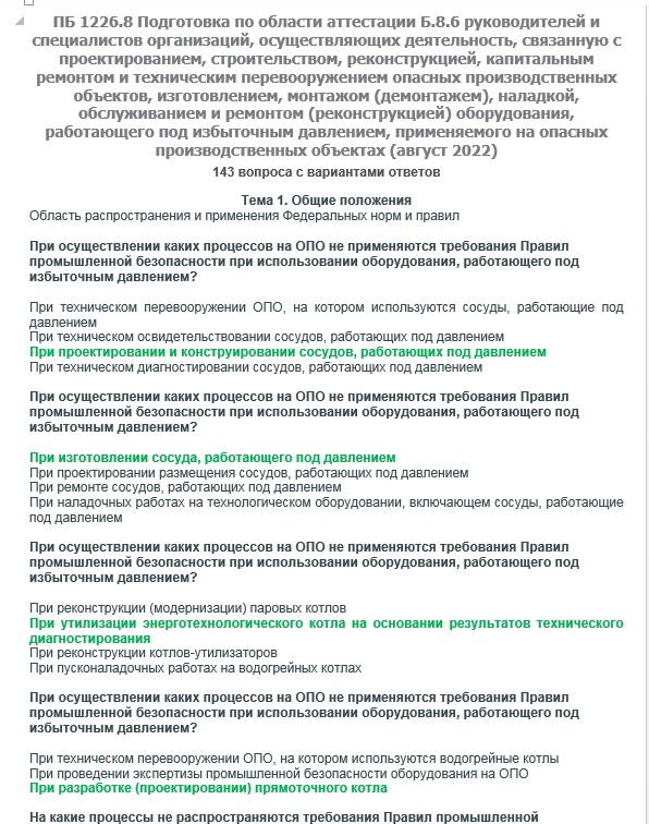 Вопросы с ответами к курсам ОКС-Олимп Б.8.6 ПБ 1226.8 (август 2022) Подготовка по области аттестации Б.8.6 руководителей и специалистов организаций, осуществляющих деятельность, связанную с проектированием, строительством, реконструкцией