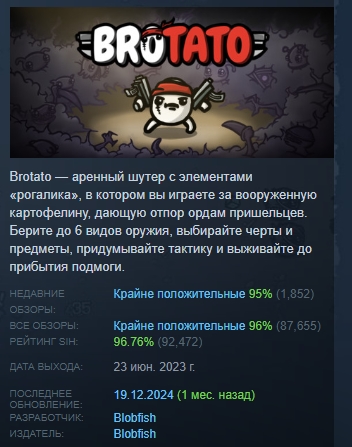 Brotato — аренный шутер с элементами «рогалика», в котором вы играете за вооруженную картофелину, дающую отпор ордам пришельцев. Берите до 6 видов оружия, выбирайте черты и предметы, придумывайте тактику и выживайте до прибытия подмоги.