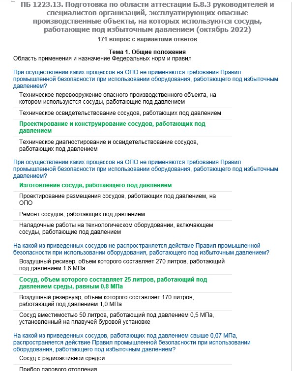 Вопросы с ответами к курсам ОКС-Олимп Б.8.3 ПБ 1223.13 (октябрь 2022) Подготовка и аттестация руководителей и специалистов организаций, эксплуатирующих сосуды, работающих под избыточным давлением, на опасных производственных объектах