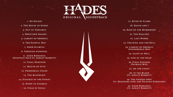 The Hades Original Soundtrack by award-winning composer Darren Korb features two and a half hours of blood-pumping music created exclusively for our god-like rogue-like dungeon crawler.The album features additional vocals by longtime collaborator Ashley Barrett, and has been specially remastered for stand-alone listening.