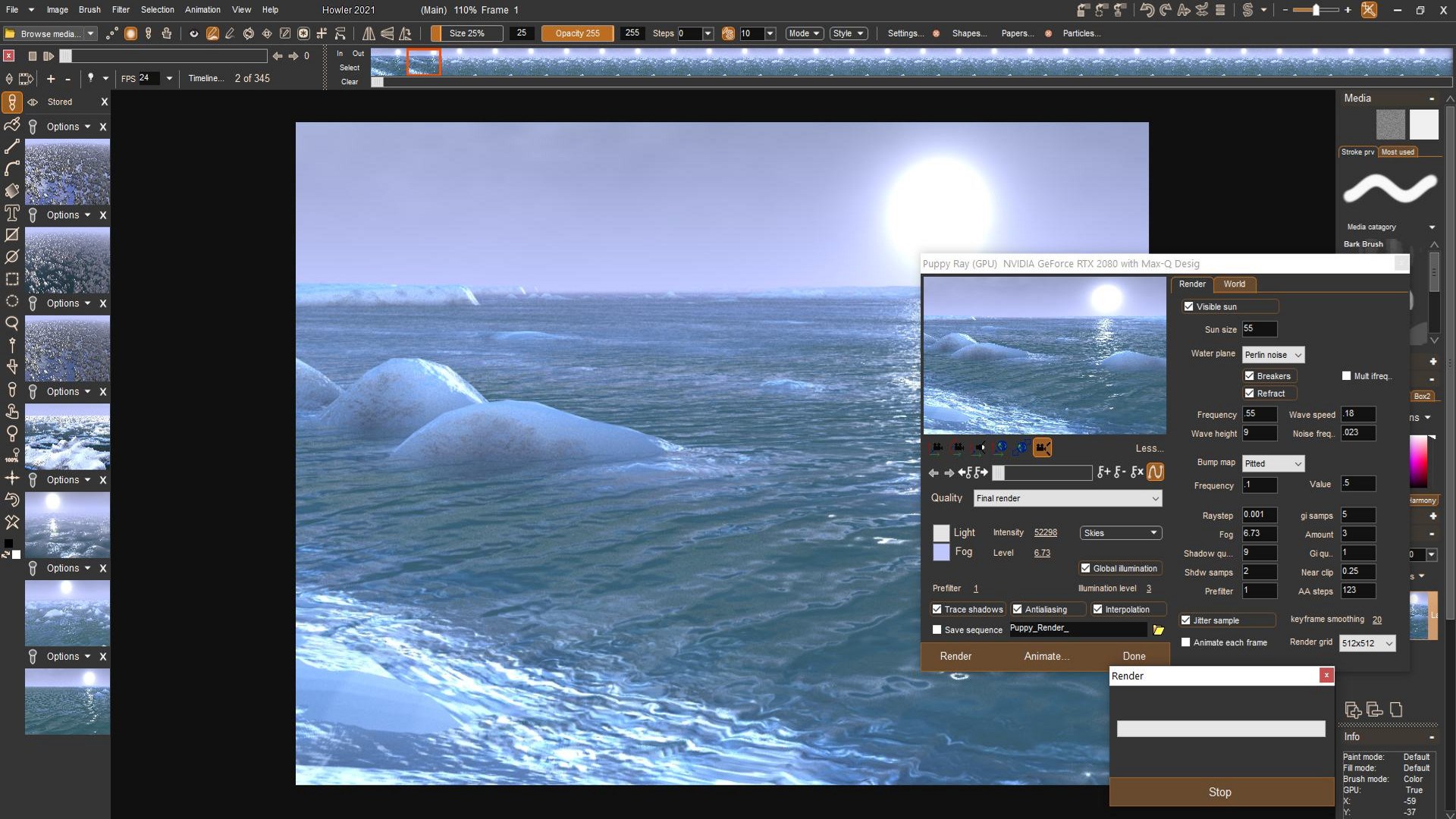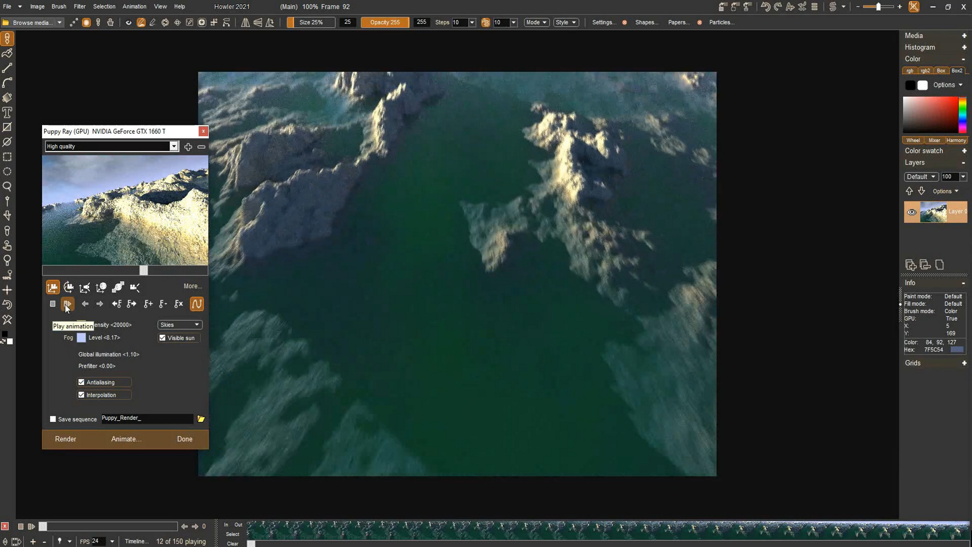 PD Howler - это быстрая программа для цифровой живописи и анимации, т.е. творческое программное обеспечение для вашего ПК.Серия программ для цифровой живописи и визуальных эффектов PD Howler вернулась с PD Howler ´21 (версия 14). Приложение значительно расширилось, улучшились инструменты рисования, анимации, 3D и Visual FX.Мы получили инструменты для генерации 3D-ландшафтов с GPU-ускорением, рендеринг с трассировкой траектории, рисование видео на видео, отслеживание движения, стабилизацию изображения, ротоскопирование, руководства художника, редактирование фотографий, рисование реалистичных сред с высыханием, полупрозрачностью и поднятием пигмента, инструменты для пост-работы и фильтры спецэффектов, растяжение времени с интерполяцией по оценке движения, кисти частиц, кисти листвы, кисти щетины, кисти орбикул, пользовательские анимированные кисти, кисти для видео, лист экспозиции для синхронизированной по губам мультипликации, анимированное рисование кадров, инструменты для создания зацикленного и бесшовного видео, потрясающие блики на линзах и многие другие удивительные инструменты и приспособления.