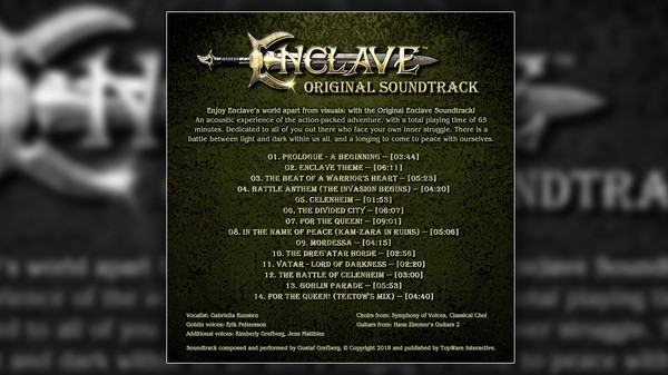 Enjoy Enclave´s world apart from visuals: with the Official Enclave Soundtrack! An acoustic experience of the action-packed adventure, with a total playing time of 65 minutes. Dedicated to all of you out there who face your own inner struggle. There is a battle between light and dark within us all.