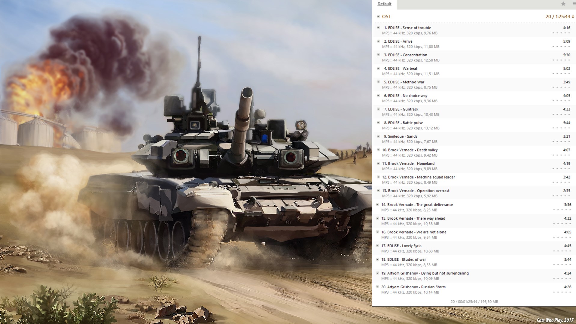Саундтрек из игры "Сирия: Русская буря". После скачивания вы можете найти саундтрек в каталоге с игрой в подкаталоге OST.Плейлист: 01-EDLISE-Sense of trouble - 4.16