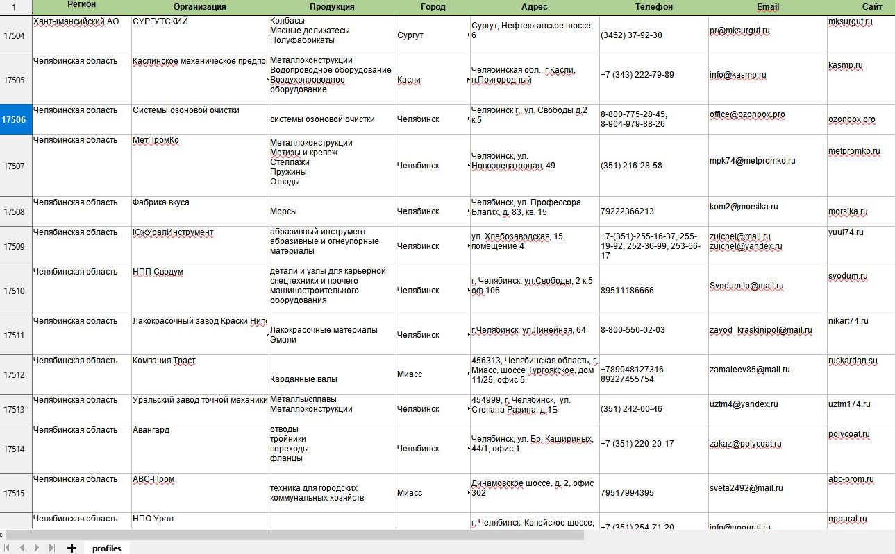 Файл Excel содержит таблицу из 18570 компании производителей и поставщиков различных товаров