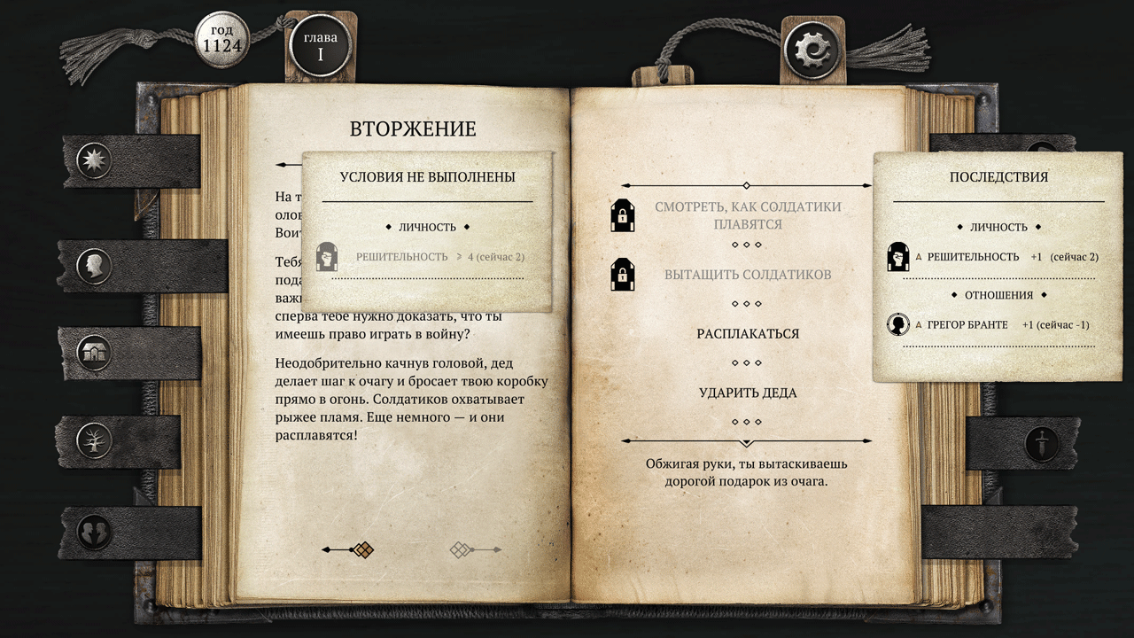 Игра разделена на главы со множеством сцен, все совершенные персонажем поступки, приобретенные навыки и сопутствующие обстоятельства складываются в уникальный сюжет. Каждое решение имеет последствие, и вам придется держать за него ответ на протяжении всей игры. Защитить семью и близких, управлять государством или же изменить старый порядок – делайте выбор и наблюдайте, куда завели вас собственные желания.