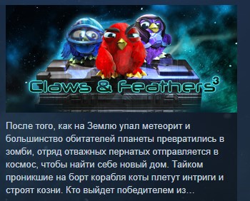 В результате столкновения с огромным астероидом среди пернатого населения Земли разразился самый настоящий зомби-апокалипсис! Не в силах справиться с нашествием, птицы в спешном порядке создают звездолет, чтобы покинуть планету и найти новый дом на просторах Вселенной. Их извечные противники, кошки, которым тоже досталось от зомби, тайком проникают на космический корабль и теперь этой пестрой компании предстоят долгие месяцы совместного полета, во время которого вас ждут захватывающие и увлекательные приключения!