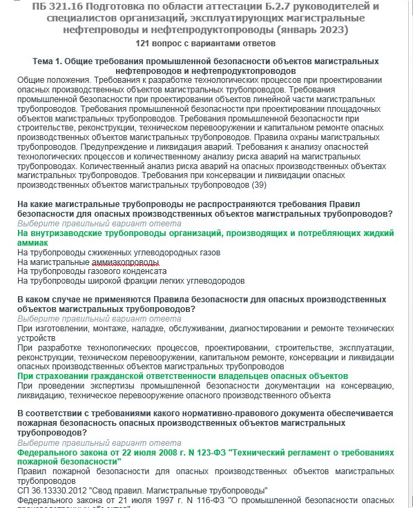 Вопросы с ответами к курсам ОКС-Олимп Б.2.7 ПБ 321.16 (январь 2023) Подготовка и аттестация руководителей и специалистов организаций, эксплуатирующих магистральные нефтепроводы и нефтепродуктопроводы