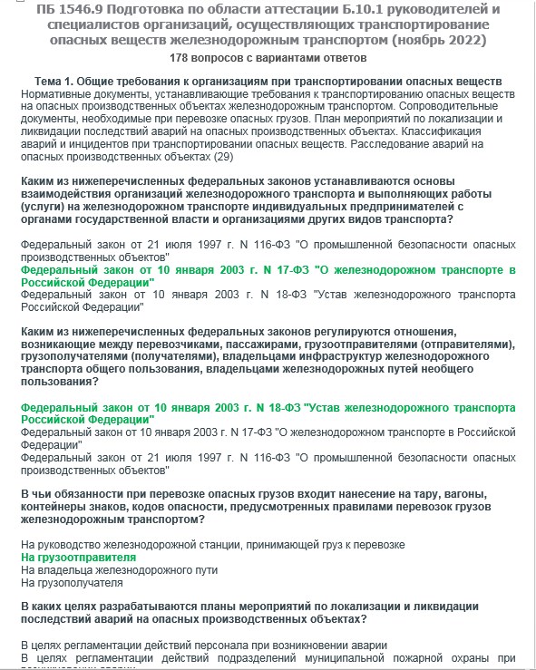 Вопросы с ответами к курсам ОКС-Олимп Б.10.1 ПБ 1546.9 (ноябрь 2022) Подготовка и аттестация руководителей и специалистов организаций, эксплуатирующих опасные производственные объекты, связанные с транспортированием опасных веществ железнодорожным транспортом