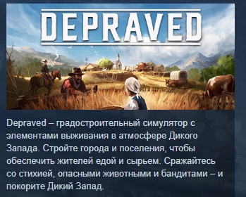 В Depraved вы поведете первопроходцев на Дикий Запад. Ваше приключение в этом процедурно генерированном мире начнется всего лишь с одной повозкой с ресурсами. Выберите подходящее место для первого поселения и раздобудьте материалы: возьмите их у матушки-природы или начните торговлю. Создайте новую страну для переселенцев. Чем они счастливее, тем быстрее растет ваш город.