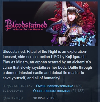 Bloodstained: Ritual of the Night – это всеохватывающий игровой опыт в ролевом боевике сайд-скроллере, впитавшем в себя все самое лучшее, что вам только может прийти в голову из жанра метроидвания. Все в одной, насыщенной контентом до предела игре.