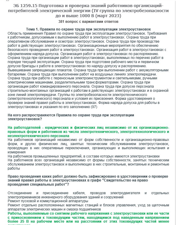 Вопросы с ответами к курсам ОКС-Олимп ЭБ 1259.15 (март 2023) Подготовка и проверка знаний работников организаций-потребителей электрической энергии (IV группа до и выше 1000В)