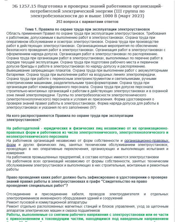 Вопросы с ответами к курсам ОКС-Олимп ЭБ 1257.15 (март 2023) Подготовка и проверка знаний работников организаций-потребителей электрической энергии (III группа до и выше 1000В)