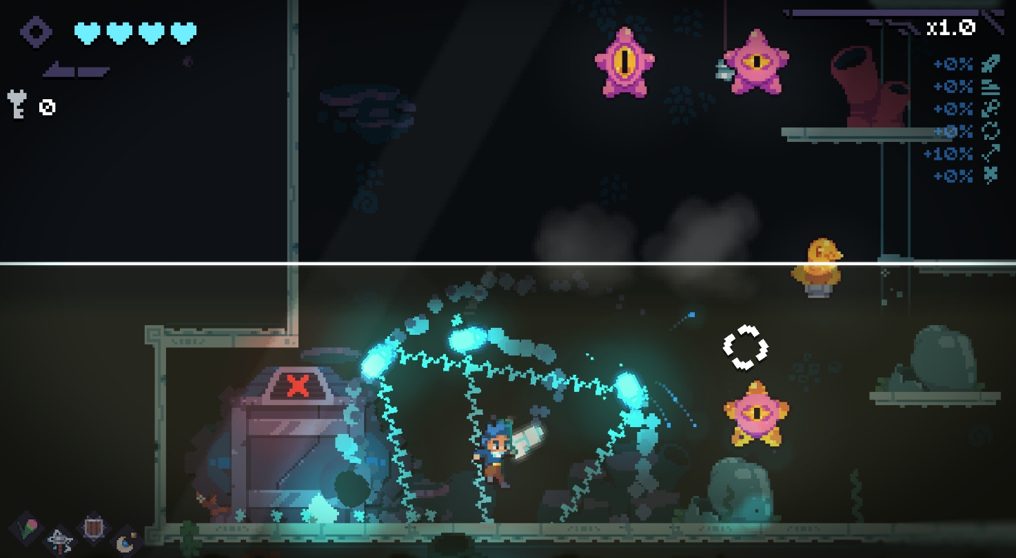 Стрельба двумя джойстиками, рывки и скольжение по стенам — это только начало. Находите бонусы и предметы при каждом забеге и улучшайте свой арсенал.