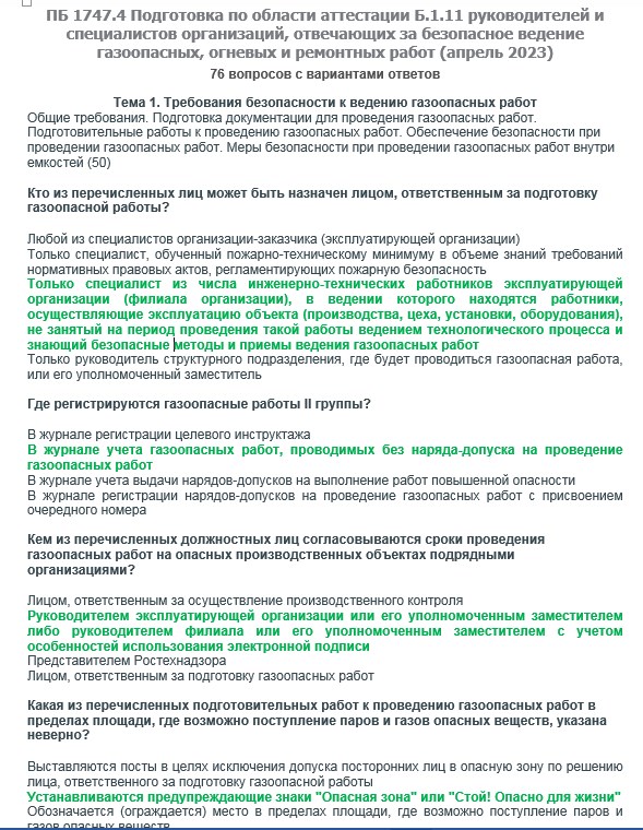 Вопросы с ответами к курсам ОКС-Олимп Б.1.11 ПБ 1747.4 (апрель 2023) Подготовка по области аттестации Б.1.11 руководителей и специалистов организаций, отвечающих за безопасное ведение газоопасных, огневых и ремонтных работ