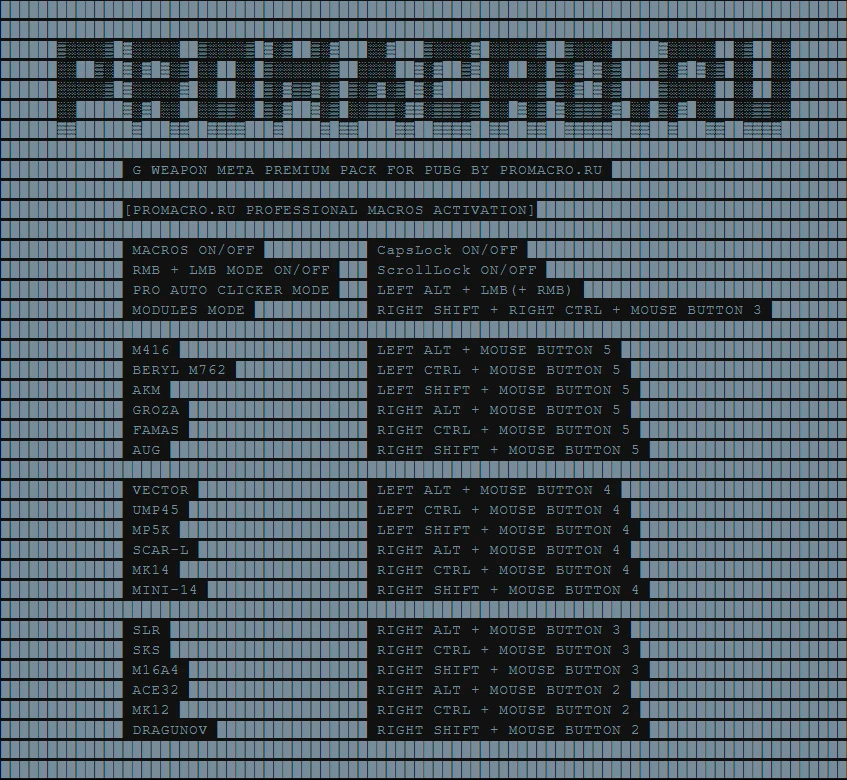 - PRO Weapon G макросы для M416, BERYL M762, AKM, GROZA, FAMAS, AUG, VECTOR, UMP45, MP5K, SCAR-L, MK14, MINI-14, SLR, SKS, M16A4, ACE32 и MK12 в одной Lua макрос-программе!