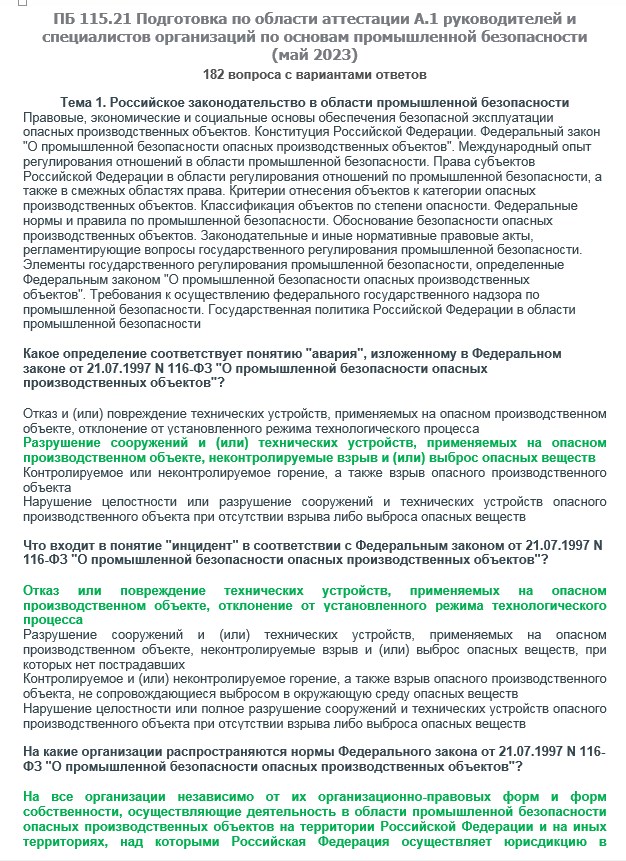 Вопросы с ответами к курсам ОКС-Олимп A.1 ПБ 115.21 (май 2023) Подготовка и аттестация руководителей и специалистов организаций по основам промышленной безопасности