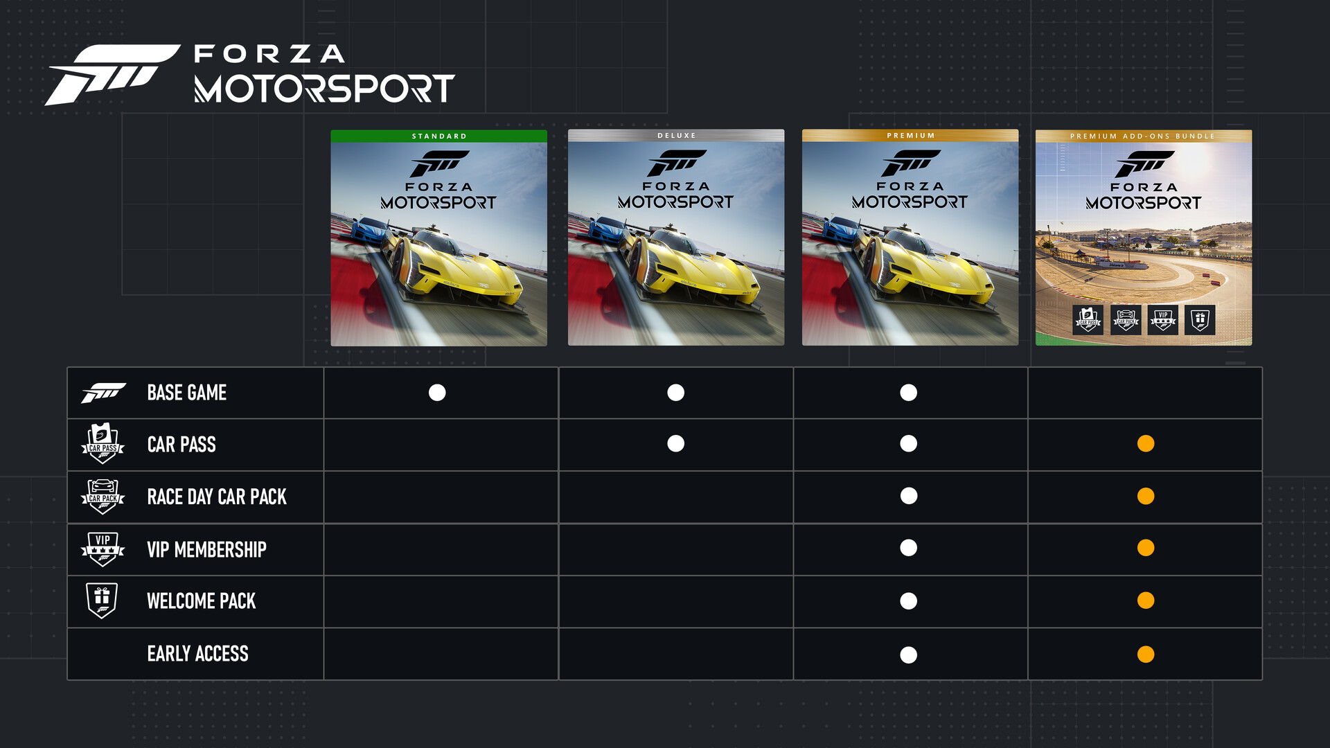 • Forza Motorsport Premium Edition включает полную версию игры, а также ранний доступ на 5 дней, набор машин «День гонки», абонемент на 30 новых автомобилей, которые будут доставляться по одному еженедельно, VIP-статус и приветственный набор.
