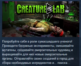 Попробуйте себя в роли сумасшедшего ученого! Проводите безумные эксперименты, смешивайте мутагены, создавайте омерзительных чудовищ и выращивайте для них новые омерзительные органы. Отправляйте своих созданий в город для сбора необходимых ингредиентов и... поиска новых подопытных!