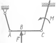 Найти вертикальную составляющую реакции в шарнире С, если сила F = 600 Н, размеры ВС = 2АВ.