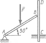 Стержень АВ концом В свободно опирается на вертикальный стержень СД, один конец которого заделан в основание. К середине стержня АВ приложена вертикальная сила F = 2 кН. Определить в кН реакцию в точке В.