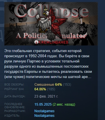 Это глобальная стратегия, события которой происходят в 1992-2004 годах. Вы берёте в свои руки личную Партию в условиях тотальной разрухи одного из вымышленных постсоветских государств Европы и пытаетесь реализовать свои (или чужие) политические мечты на шаткой арене этого ветхого образования.