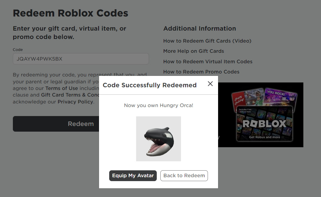 2) Перейдите на roblox.com/redeem и введите свой код.