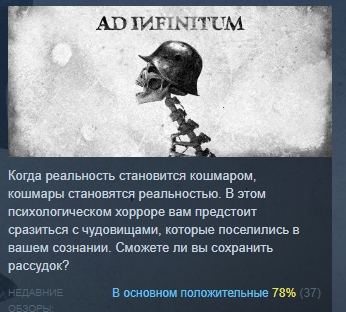 Закончится ли когда-нибудь этот кошмар войны? Сумеете ли вы обрести покой? В Ad Infinitum вы играете за немецкого солдата, которого преследуют ужасы Великой войны. Пока воспоминания о доме и семье сменяются кошмарами, пережитыми в траншеях на фронте, вы пытаетесь положить конец вечным страданиям.