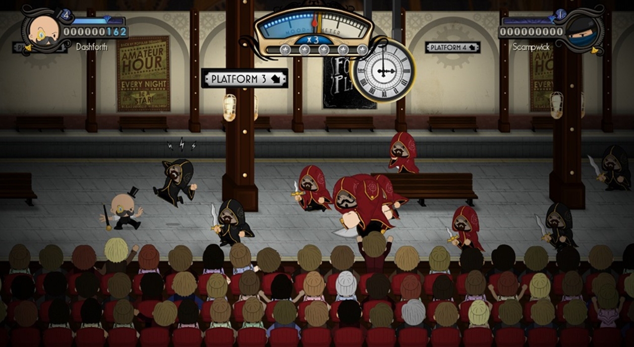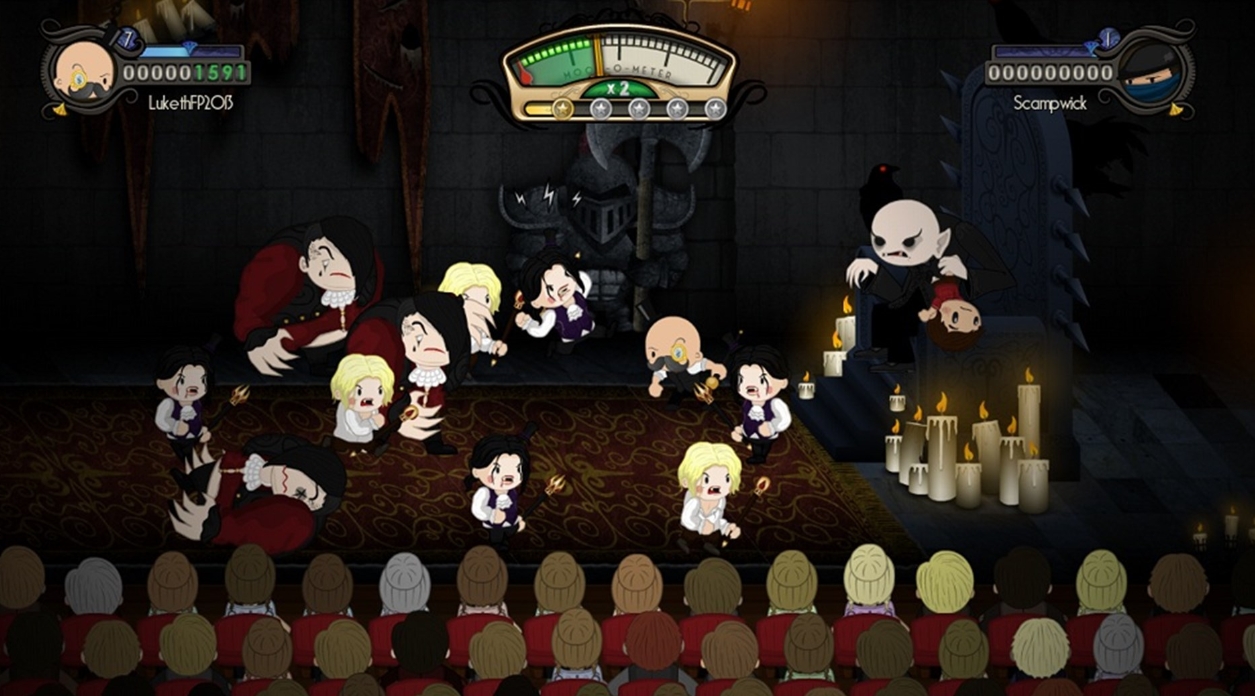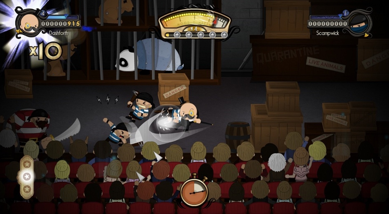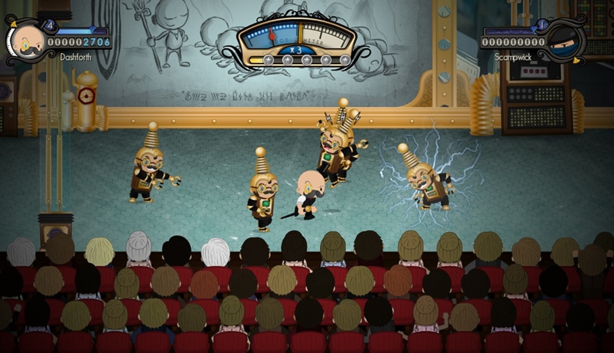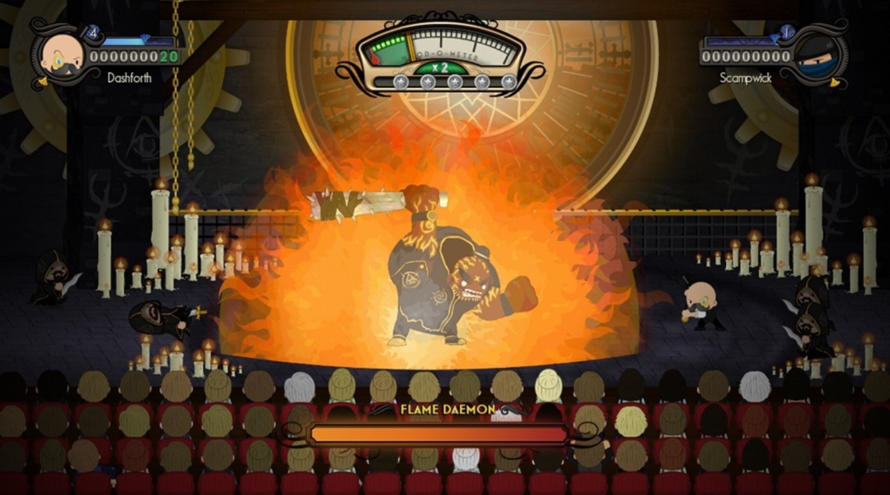 Играйте за охотника на демонов барона Дэшфорта в боевике с боковой прокруткой, действие которого происходит ПОЛНОСТЬЮ на театральной сцене. Выполняйте сокрушительные удары и реверсы! Наэлектризуйте зрителей совместными атаками, пригласите друга присоединиться к нему в качестве помощника Скэмпвика и используйте все известные вам сценические трюки, чтобы разрушить дом! Разыграйте самые захватывающие моменты из жизни барона; невероятные звери, поразительные злодейства и, в основе всего этого, загадочная Грязная игра.