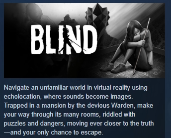 Blind is a narrative-driven psychological thriller for virtual reality where the player is blind and must explore their surroundings using echolocation.