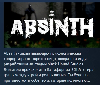 Absinth - захватывающая психологическая хоррор-игра от первого лица, созданная инди-разработчиками студии black Hound Studios. Действие происходит в Калифорнии, США, стирая грань между игрой и реальностью. Ты будешь противостоять событиям, которые полностью изменили жизнь Зейна.