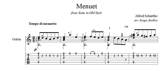 Аранжировка для гитары Менуэта Альфреда Шнитке - третьей части Сюиты в старинном стиле для скрипки и фортепиано.