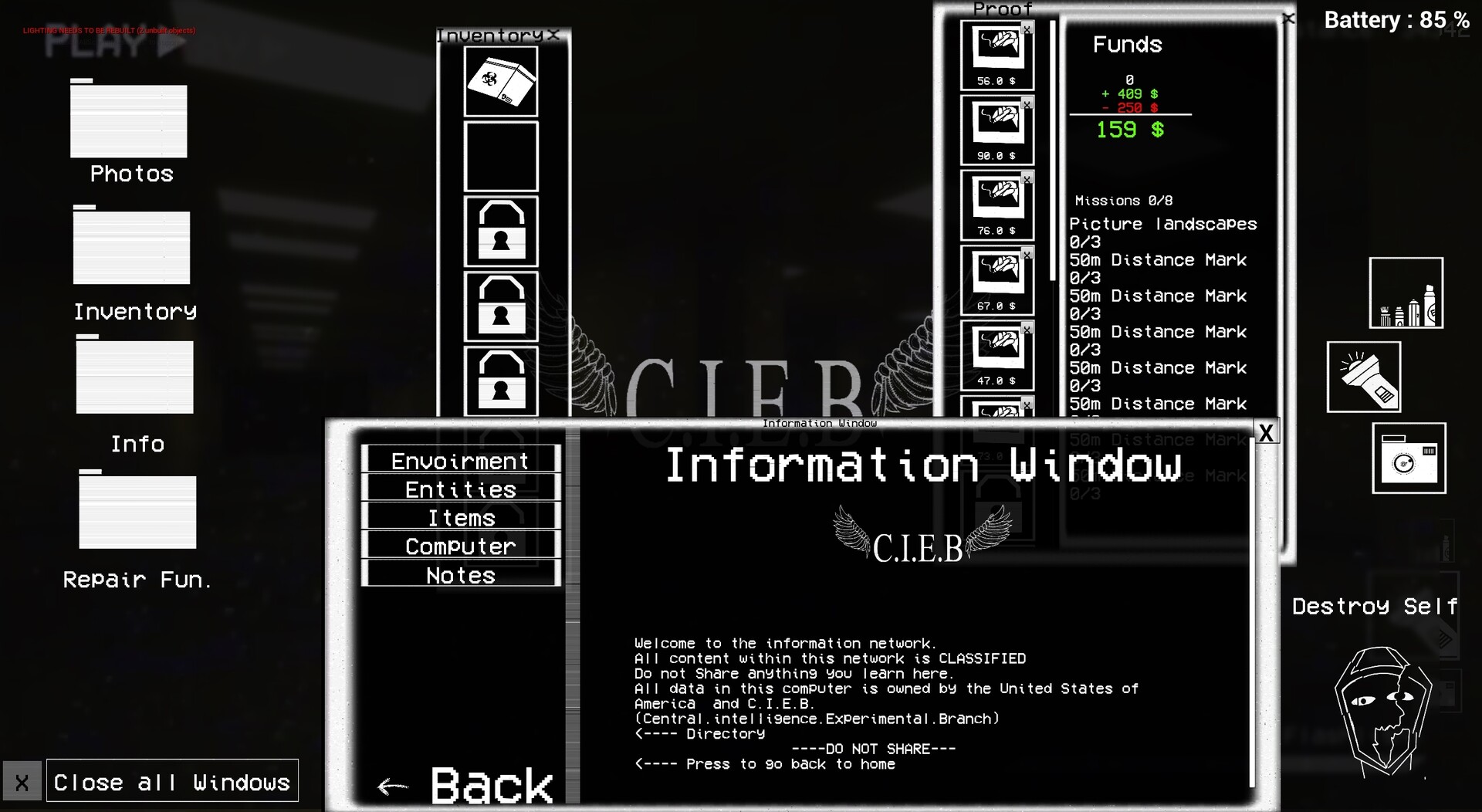You were abducted by a organization lead by the C.I.A. They have your son and see you as a mule to explore a world beyond ours. The Backrooms. Now you must explore, collect and build up your LAB to collect a profit. They promised you freedom if you help them. Can you trust them?