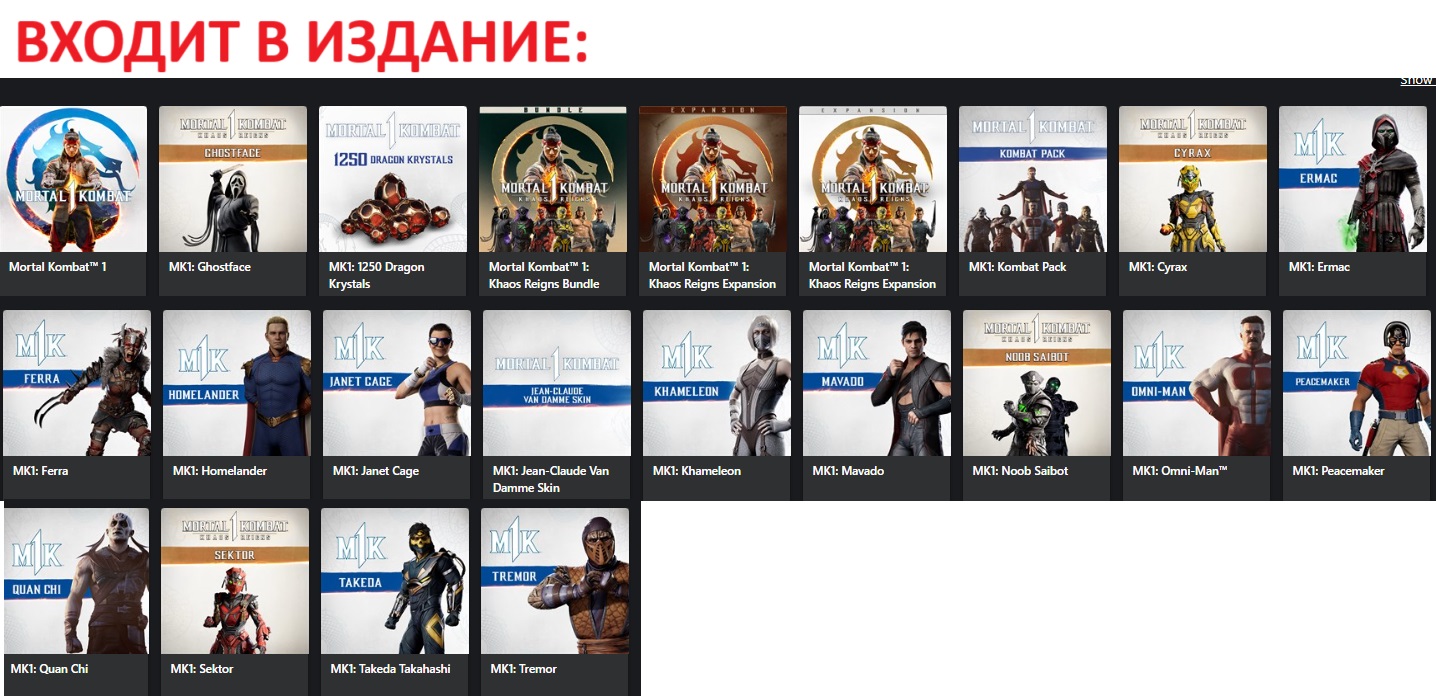 Включает мгновенный доступ к базовой игре, боевому набору и кристаллам дракона. Получите доступ к предстоящему сюжетному расширению, Kombat Pack 2 и многим другим!