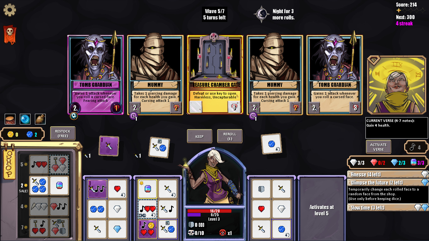 Circadian Dice is a game inspired by single-player deck-building games, but instead of upgrading a deck, you build up a set of dice! Use 10 different heroes and 60 game-warping relics to take on 13 hand-crafted scenarios, in runs that take 10-30 minutes. Lots of secrets and unlocks to discover!