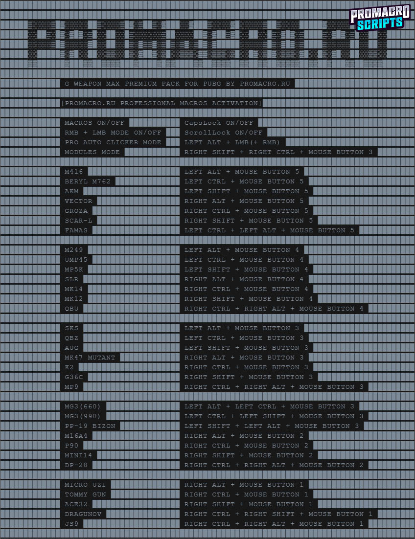 - PRO Weapon G макросы для JS9, M416, BERYL M762, AKM, VECTOR, GROZA, SCAR-L, FAMAS, M249, UMP45, MP5K, SLR, MK14, MK12, QBU, SKS, QBZ, AUG, MK47 MUTANT, K2, G36C, MP9, MG3, PP-19 BIZON, M16A4, P90, MINI14, DP-28, MICRO-UZI, TOMMY GUN и ACE32.