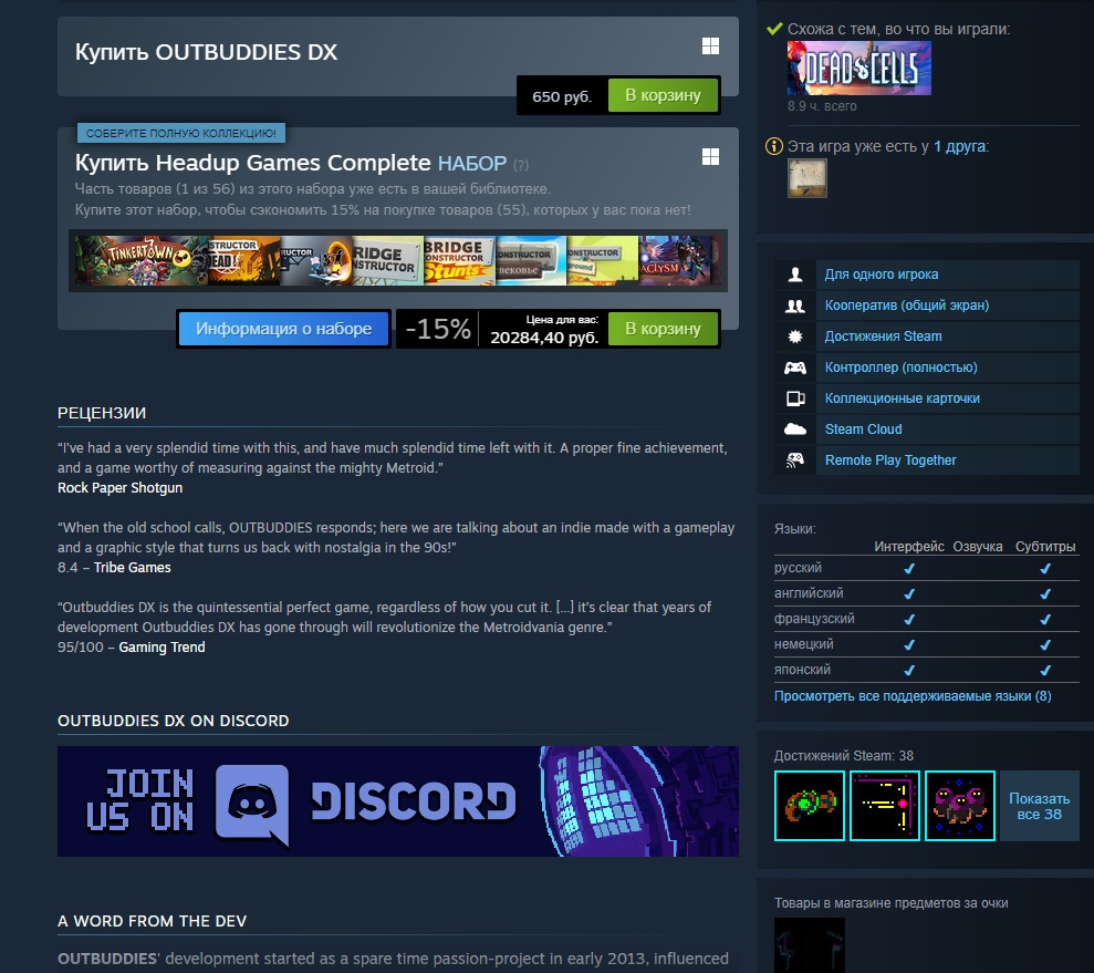 Outbuddies DX — скромный проект со скромным бюджетом, но это не значит, что перед вами игра низкого качества. Пиксельная графика идеально масштабируется без искажения и помех под разрешение вашего экрана. Игра работает с частотой 60 кадров в секунду. Гибридная физическая модель обеспечивает реалистичную обработку ускорения и движения объектов, в то же время сохраняя безупречную точность управления, как в старых классических играх. Искусственный интеллект врагов и боссов делает их очень опасными соперниками, которые справляются со своей работой ничуть не хуже, чем их коллеги из игр жанра souls! Outbuddies DX также поддерживает самые разные устройства — мыши, клавиатуры и ряд геймпадов, — позволяя играть так, как вам нравится. Нам важно ваше мнение. Если вам есть что сказать — пишите!