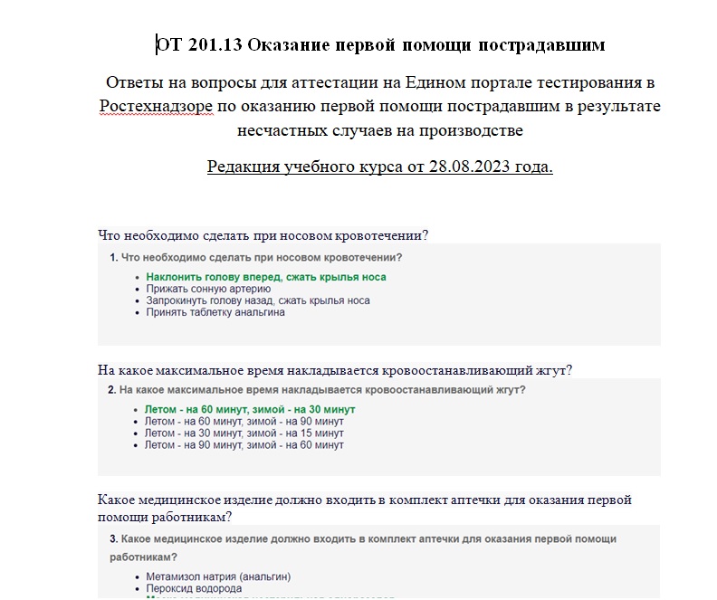Ответы на вопросы билетов аттестации на Едином портале тестирования в Ростехнадзоре по Оказанию первой помощи пострадавшим в результате несчастных случаев на производстве. Редакция учебного курса от 28.08.2023 года.